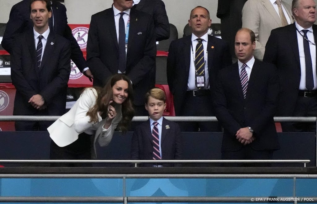 Na de eerste goal van Engeland springt George op en klapt hij net als zijn ouders vol overgave voor Luke Shaw die het eerste punt maakte. Het is voor de 7-jarige prins niet de eerste EK-wedstrijd die hij bijwoont. Bij het duel tegen Duitsland zat hij ook op de tribune.