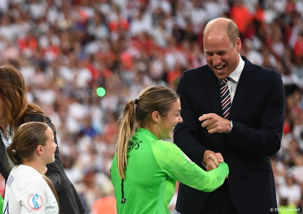 De Engelse vrouwen, die onder leiding staan van de Nederlandse bondscoach Sarina Wiegman, versloegen Duitsland na verlenging met 2-1. William feliciteerde de Engelse voetbalsters stuk voor stuk met hun prestatie. Van de meeste speelsters schudde William de hand, maar onder anderen de Engelse aanvoerster Leah Williamson kreeg een knuffel van de prins.