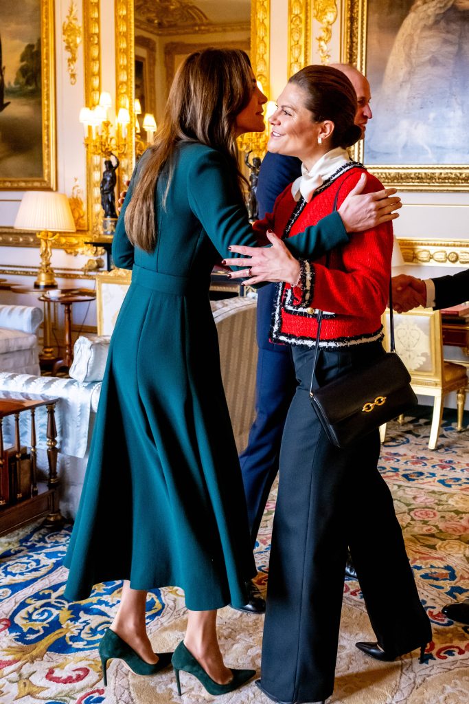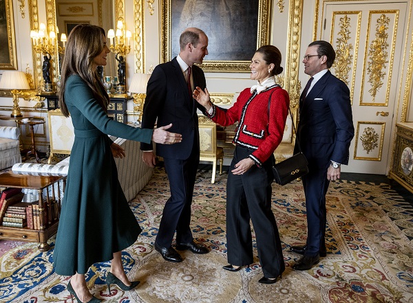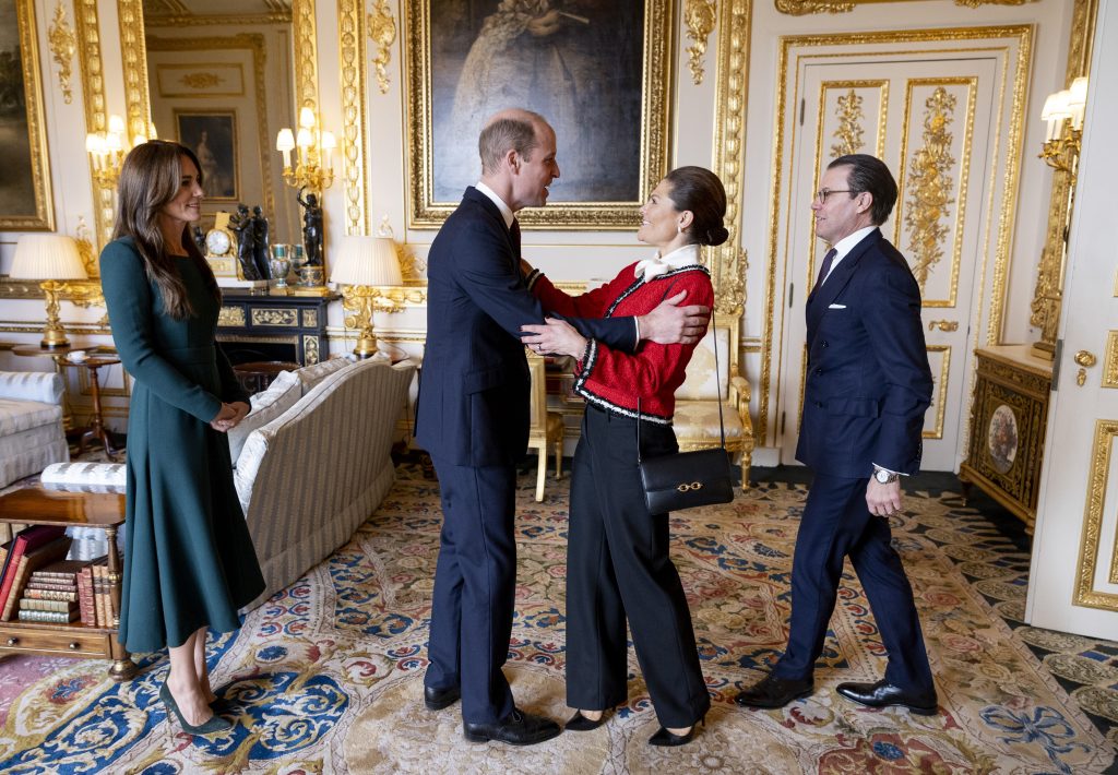 Kroonprinses Victoria van Zweden en haar man prins Daniel zijn donderdagochtend op Windsor Castle ontvangen door prins William en zijn vrouw prinses Catherine. Op de foto’s is te zien dat de vier elkaar hartelijk begroeten.