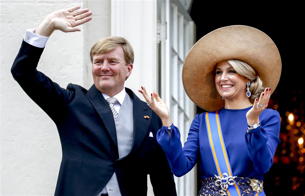 Koning Willem-Alexander en koningin Máxima wuiven dinsdagmiddag samen met prins Constantijn en prinses Laurentien vanaf het balkon van Paleis Noordeinde naar de massaal toegestroomde belangstellenden. De balkonscène is een traditie waar altijd veel mensen op afkomen.