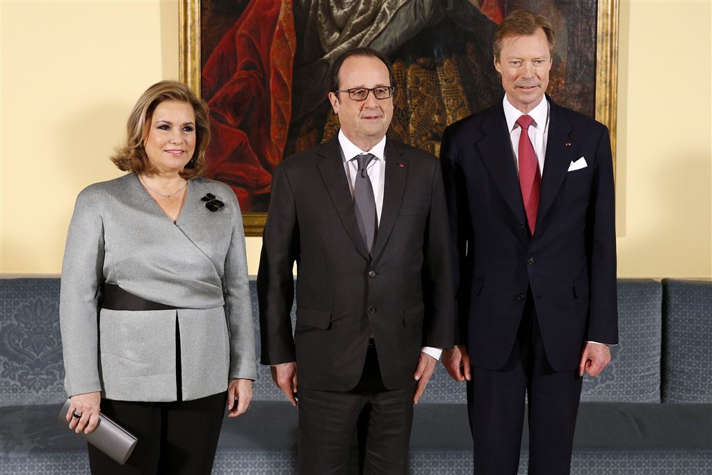 LUXEMBURG – Groothertog Henri en groothertogin Maria Teresa van Luxemburg ontvingen vrijdag François Hollande. De Franse president bracht een eendaags bezoek aan Luxemburg en kreeg een hartelijke ontvangst in het Groothertogelijk Paleis in Luxemburg-stad.