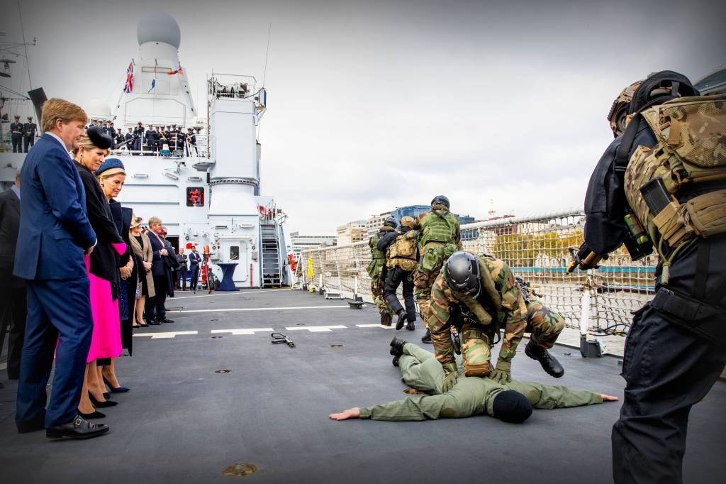 De samenwerking tussen de marines en mariniers van Nederland en het Verenigd Koninkrijk kreeg woensdagmorgen op de Londense Theems op spectaculaire wijze aandacht tijdens een bezoek van koning Willem-Alexander en koningin Máxima aan het patrouilleschip Zr Ms Zeeland.