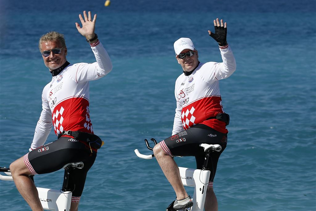 Albert fietst de 21 kilometer niet in zijn eentje; ook onder anderen voormalig Formule 1-coureur David Coulthard stapte zondag op een moderne waterfiets. De afstand van Nice naar Monaco wordt in estafetteverband afgelegd.