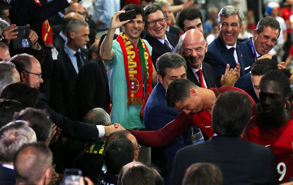 Als aanvoerder van Portugal mocht de geblesseerde Ronaldo de bokaal voor de Europees kampioen als eerste in zijn handen nemen. Maandag werd bekend dat de Portugees zijn kruisband heeft verrekt. Binnen enkele weken kan de vedette weer beschikbaar zijn voor zijn club Real Madrid.