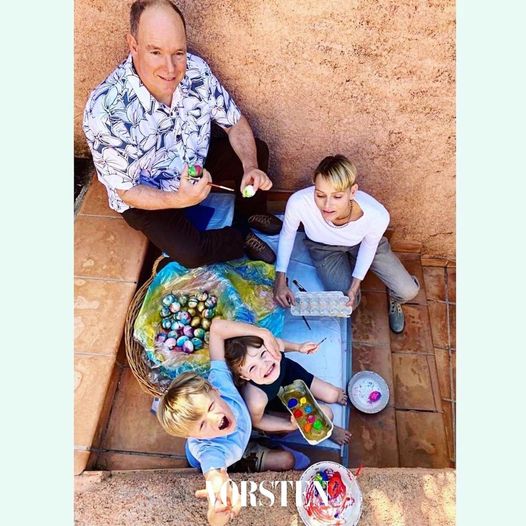 Op de foto is te zien dat Charlène met haar man prins Albert en hun zesjarige tweeling Jacques en Gabriella eieren aan het verven zijn. De kinderen kijken vol plezier in de camera terwijl ze het resultaat laten zien.