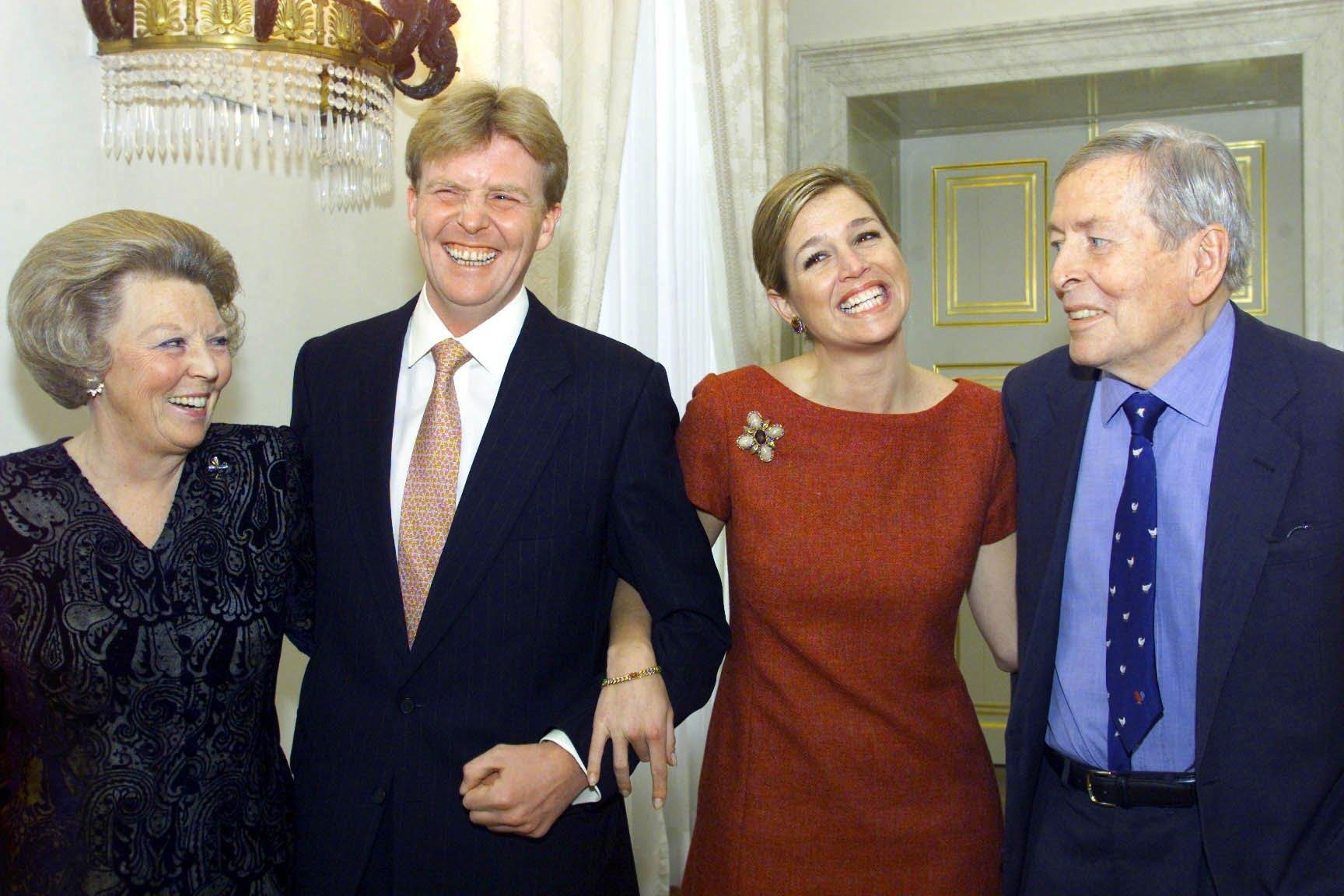 2001-03-30 18:55:55 NLD-20010330-DEN HAAG: (Vlnr) Koningin Beatrix, Prins Willem-Alexander, Maxima Zorreguieta, en prins Claus poseren op paleis Noordeinde in Den Haag na de bekendmaking van de verloving van het jonge paar. ANP FOTO/POOL/MARCEL ANTONISSE