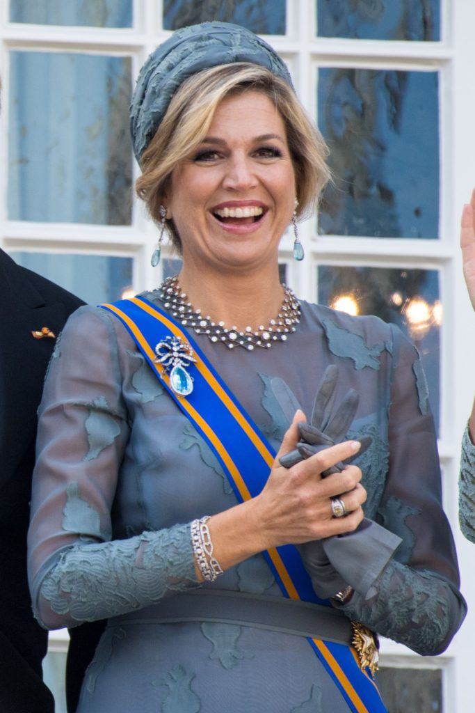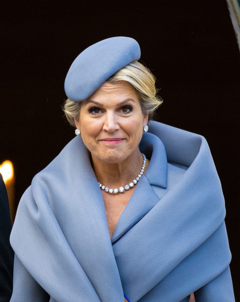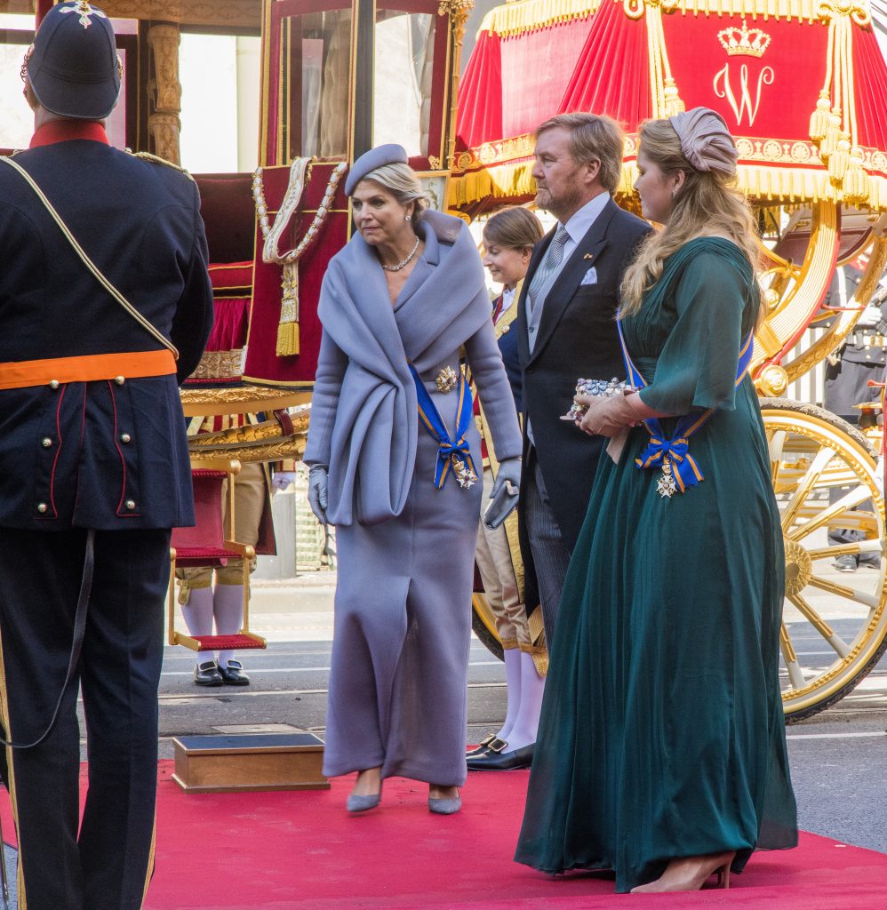Máxima stapt dit jaar de koets uit in een fris-beige aansluitende jurk met glitters van – hoe kan het ook anders – modehuis Natan. Deze jurk combineert ze met een suède jasje en een gedrapeerde cocktailhoed van Fabienne Delvigne.
