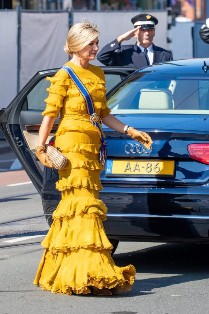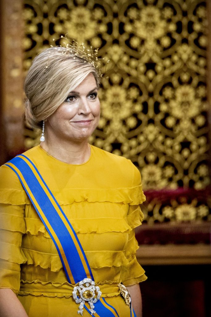 Voor haar eerste Prinsjesdag als koningin kiest Máxima voor een gouden jurk met transparante mouwen, veel borduursels, pailletten en kralen van Jan Taminiau. Ook deze jurk weegt door alle kralen en pailletten met gemak vier kilo. De asymmetrische relevé van goudkleurige sinamay is gemaakt door ontwerpster Fabienne Delvigne.