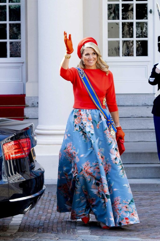 Máxima kiest voor Prinsjesdag 2021 voor een taftzijden rok in pastelkleuren met abstractie bloemenprint van Natan. Ze draagt daarop een oranje top van een fijn geweven wollen jersey met bijpassende turban.