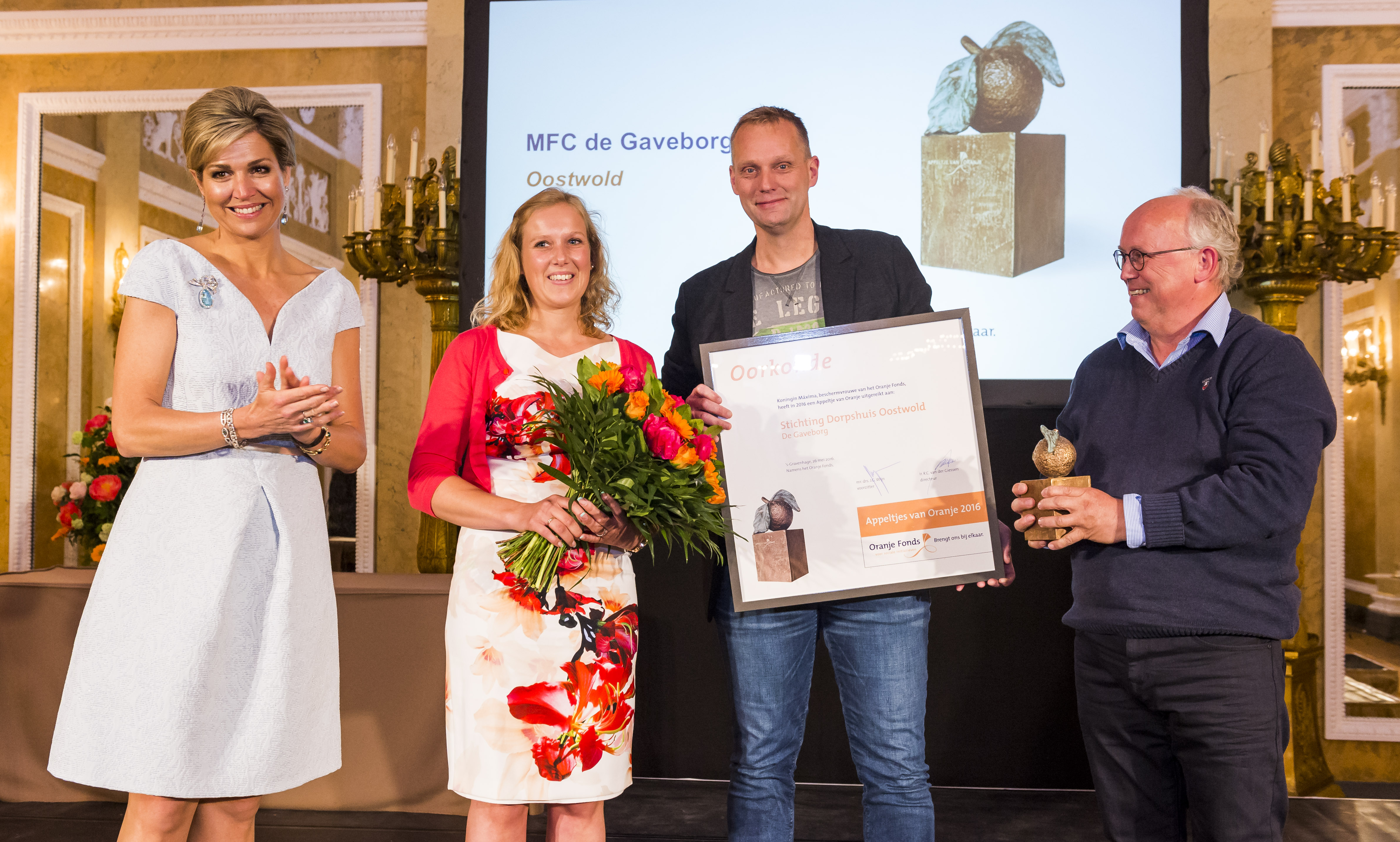 ‘Eén van de allermooiste evenementen die we op het paleis hebben.’ Koningin Máxima spreekt klare taal achter het katheder. De Appeltjes van Oranje is de jaarlijkse prijs voor initiatieven die op succesvolle wijze verschillende groepen mensen verbinden of die ervoor zorgen dat mensen weer meedoen in de maatschappij.