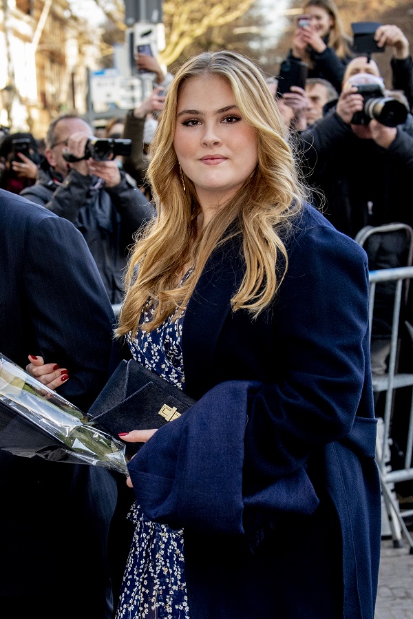 Amalia draagt dinsdag, op de dag van haar intreding bij de Raad van State, een lange zwarte jurk met een wit bloemetjesmotief en laagjes. Ook heeft een zwart tasje bij zich met een gouden knip en draagt ze een zwart vest en zwarte naaldhakken. Haar moeder, koningin Máxima, heeft een roze jurk aan met een riem en een paarse bijpassende hoed. Ook draagt de koningin paarse handschoenen, paarse schoenen en een jas en tasje in die kleur.