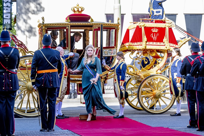Prins Amalia draagt tijdens haar eerste Prinsjesdag in haar functie als Prinses van Oranje een donkergroene japon van voile. Daarbij draagt de 18-jarige een hoed uit de collectie van haar moeder Máxima. De koningin koos voor een ijsgrijze japonmantel met een wikkelsjaal, aldus de Rijksvoorlichtingsdienst.