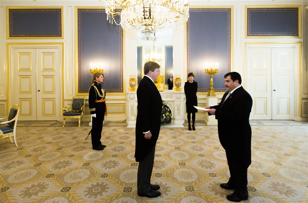 DEN HAAG – Koning Willem-Alexander heeft woensdagochtend op Paleis Noordeinde in Den Haag de geloofsbrieven van de nieuwe ambassadeur van Afghanistan ontvangen. Ambassadeur Obaidullah Obaid werd opgehaald in een galarijtuig met twee paarden ervoor.