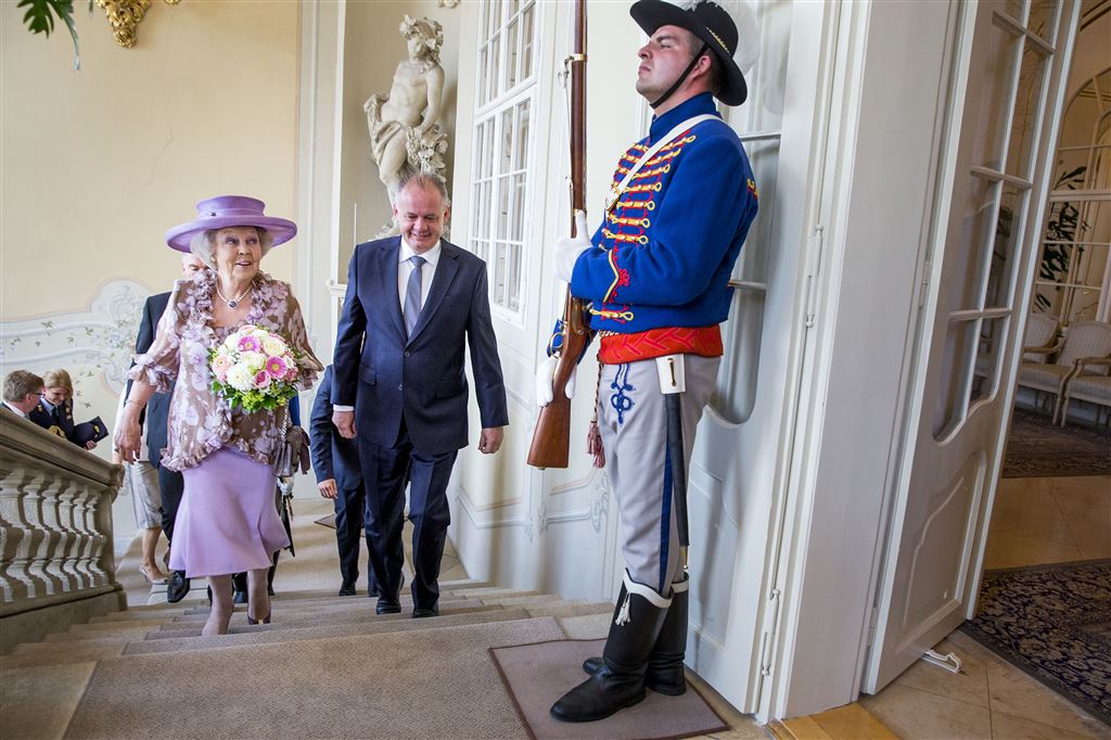 De uitbreiding is er gekomen en in dat deel van het museum kunnen nu wisselende tentoonstellingen worden getoond, zoals ‘European Stars’ met werk van de CoBrA-groep en Joan Miró. Beatrix keek wat besmuikt bij zoveel lof van de enthousiaste Meulensteen, die Bratislava een kunstparel heeft gegeven. En die parel wilde Beatrix na de rondgang door het museum en de aansluitende receptie voor vertrek ook wel even vanaf het dak bekijken.