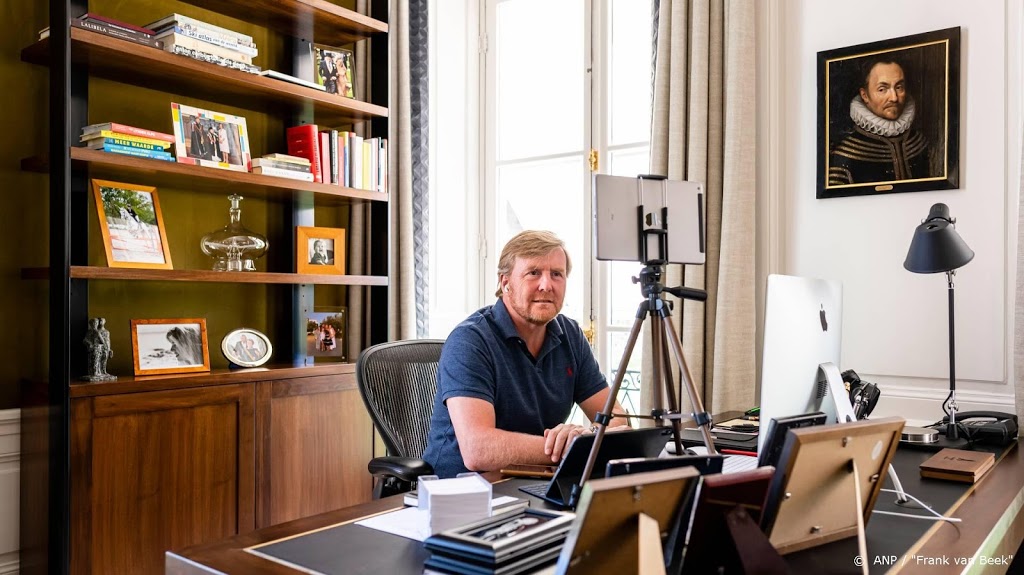 De thuiswerkbeelden van Willem-Alexander toonden de koning zelf ook van een andere kant. Zijn overhemd is ingeruild voor een polo en hij is met blote enkels te zien in zijn instappers.