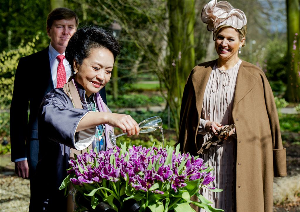 ‘First lady’ Peng Liyuan goot aansluitend op de presentatie een glas champagne over de paarse Cathay-tulpen, die in Nederland zijn gekweekt. Ook tekende ze het bijbehorende certificaat. Het staatsbezoek wordt na een lunch op Kasteel Keukenhof formeel afgesloten, al brengt Xi maandag nog een bezoek aan het parlement.