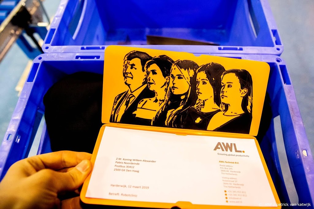 Aan de hand van onder meer de gele enveloppe illustreerde AWL-Techniek, dat is gespecialiseerd in de ontwikkeling van high-end geautomatiseerde verbindingstechnologieën, de lasertechniek waarmee het bedrijf werkt. De briefomslag met een afdruk van een van de foto’s die Erwin Olaf van het koninklijk gezin maakte, kwam uit een 3d-printer rollen. Een robot overhandigde het presentje aan Willem-Alexander.