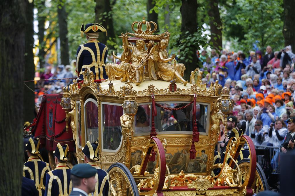 DEN HAAG – Na een korte rijtoer door het centrum van Den Haag zijn koning Willem-Alexander en koningin Máxima dinsdagmiddag in de gouden koets aangekomen op het Binnenhof. Een commissie van in- en uitgeleide ontving het koningspaar bij de ingang van de Ridderzaal.