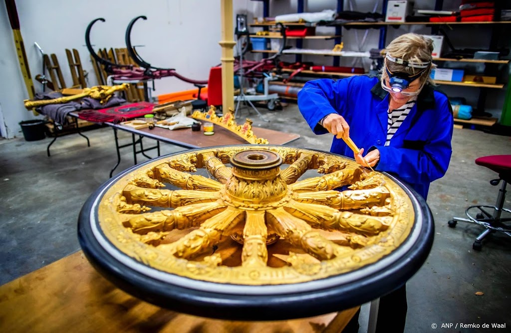 Op dit moment neemt daar onder anderen houtrestaurateur Yvonne Nijlunsing de wielen en ornamenten van de koets onder handen. “Ik moet ieder kiertje of scheurtje opvullen, maar wel met dezelfde soort hout die oorspronkelijk is gebruikt en dat verschilt”, aldus Nijlunsing. Ze heeft daarbij meer werk aan de buitenkant van de wielen dan de binnenkant. “Het buitenwerk is veel meer beschadigd.”