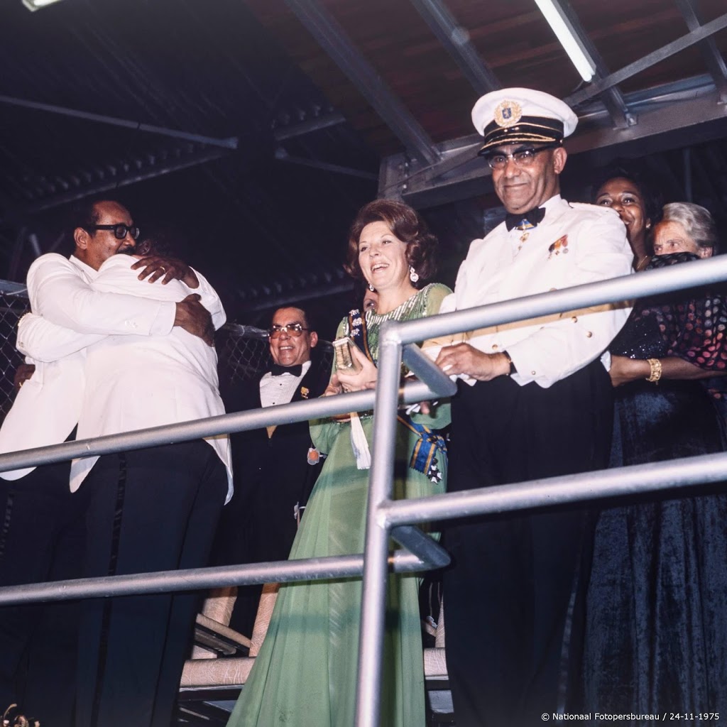 Ook de Onafhankelijkheidsverklaring zelf is te zien. Prinses Beatrix vertegenwoordigde bij de ceremonie in 1975 haar moeder koningin Juliana.