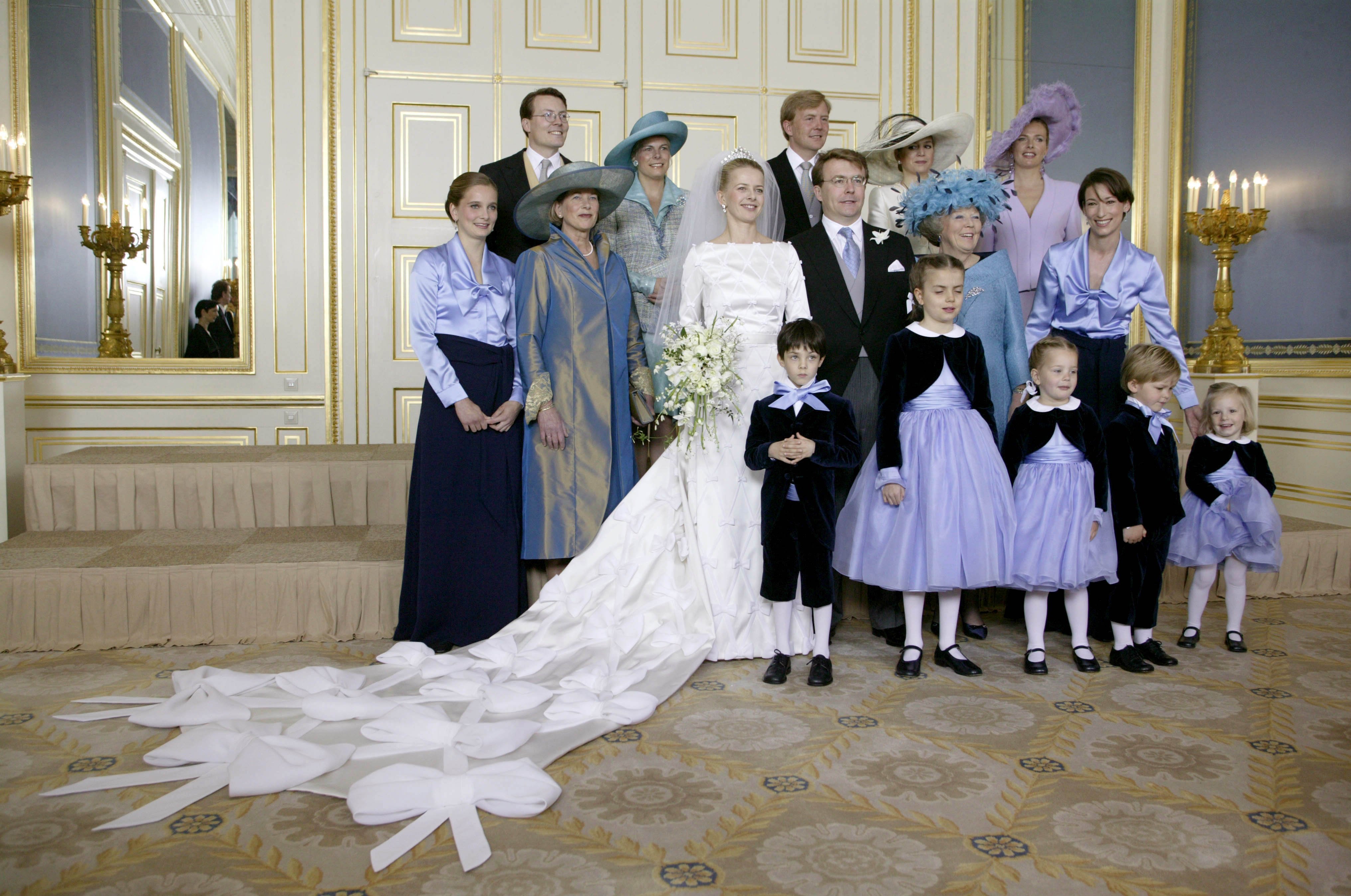 2004-05-04 13:24:29 Caption: NLD-20040424-DEN HAAG: Het bruidspaar prins Johan Friso en Mabel Wisse Smit met hun naaste familieleden zaterdagochtend op Paleis Noordeinde in Den Haag. Op de voorste rij de bruidskinderen (vlnr) Max Knap (6), Theodora Petalas (9), Lotte Crombag (4), Friso Wisse Smit (3) en Anne van Lippe-Biestefeld van Vollenhoven. Middelste rij (VLNR) Eveline Wisse Smit (zus van bruid), mevr. F.M.G. Wisse Smit (moeder van de bruid), Mabel Wisse Smit, prins Johan Friso, Koningin Beatrix en barones Sophie von der Recke (getuige van de bruidegom). Op de bovenste rij (VLNR): Prins Constantijn, prinses Laurentien, kroonprins Willem Alexander, prinses Maxima en Nicoline Wisse Smit (zus van bruid en moeder van bruidskindje Lotte). ANP FOTO/POOL/CAPITAL PHOTOS/RUUD TAAL