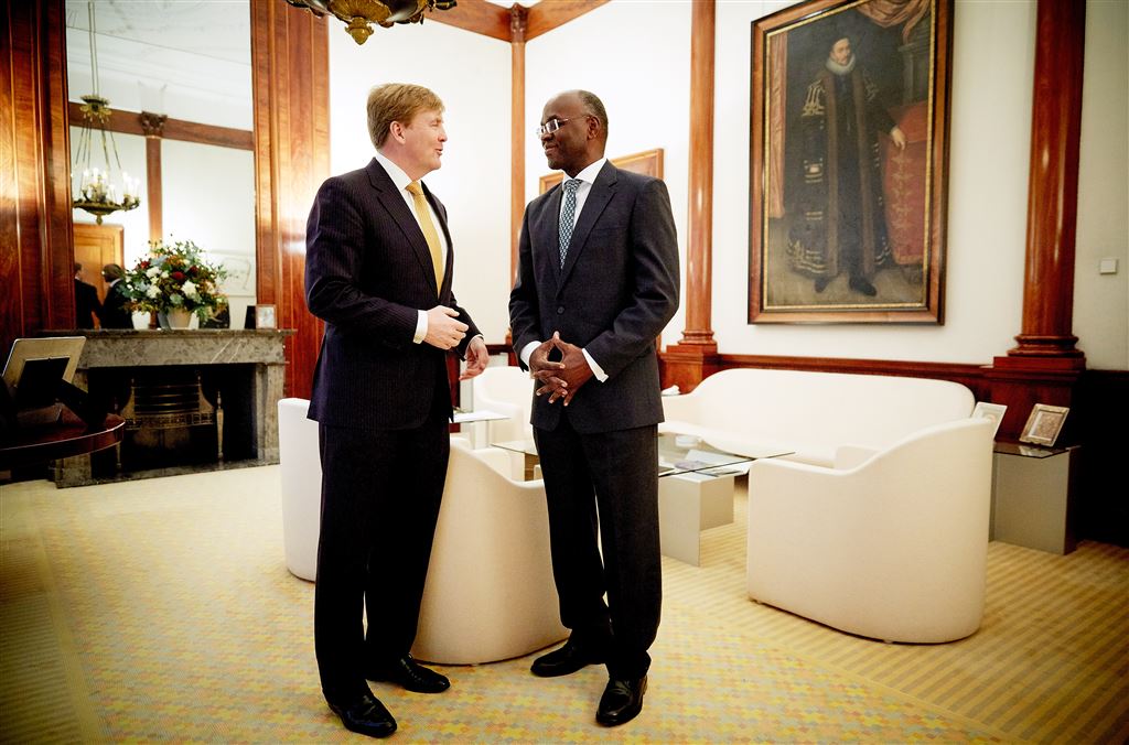 Maandagmiddag ontving koning Willem-Alexander in zijn werkkamer op Paleis Noordeinde alvast gouverneur Eugene Holiday van Sint Maarten.