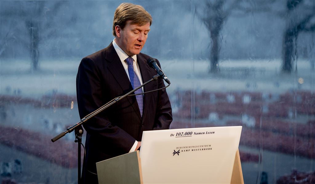 Willem-Alexander leest namen Westerbork voor
