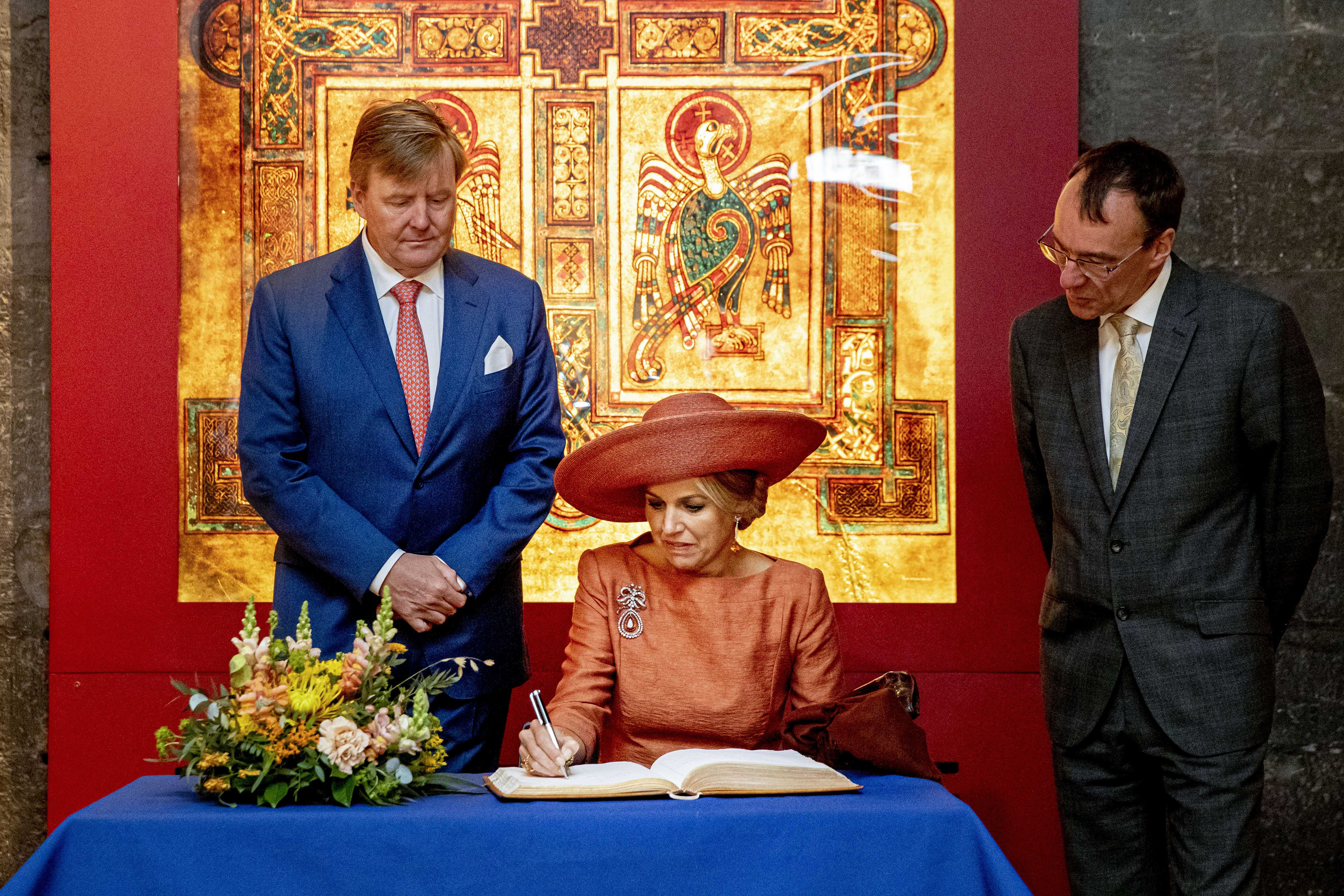 Koning Willem-Alexander en koningin Máxima zetten hun ochtendprogramma voort met een bezoek aan de wereldberoemde bibliotheek van Trinity College en daarna een ontmoeting met 350 leden van de Nederlandse gemeenschap in Ierland.