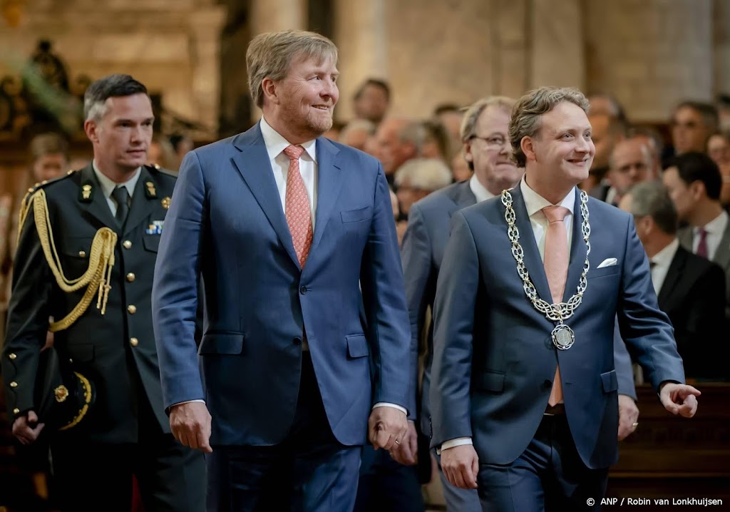De koning wandelde na bijdragen van onder anderen burgemeester van Gouda Pieter Verhoeve, Museum Gouda-directeur Femke Haijtema en bijzonder hoogleraar Bastiaan Rijpkema naar De Markt.