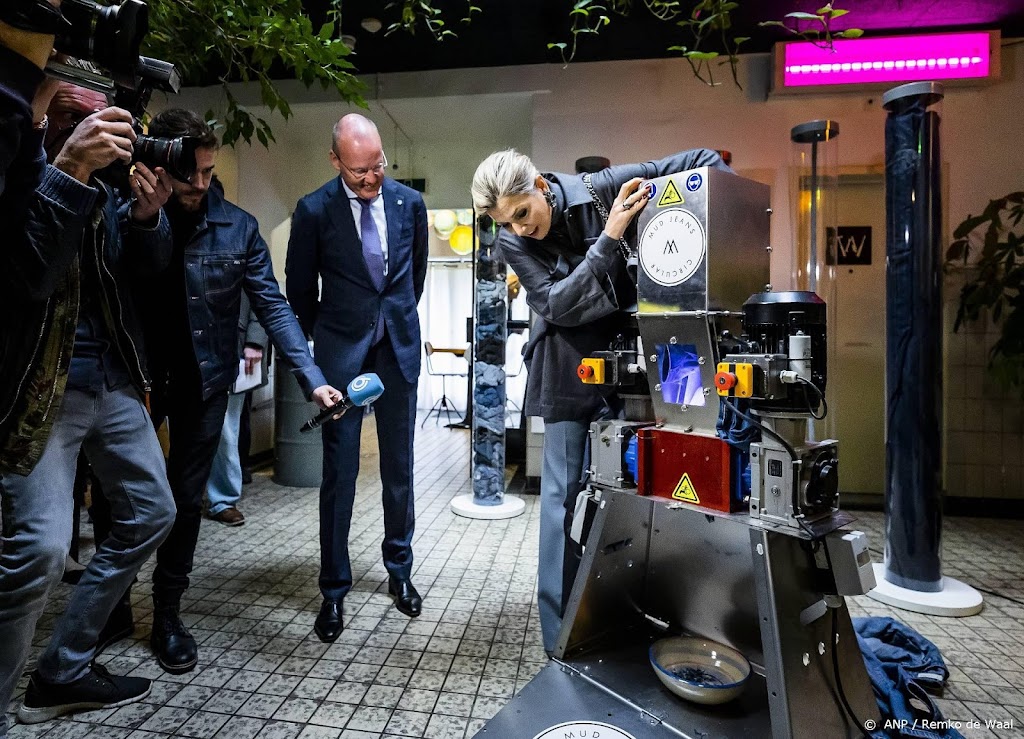 Koningin Máxima heeft woensdag bij een bezoek aan het duurzame kledingbedrijf MUD Jeans haar eigen oude spijkerbroek door de versnipperaar gehaald. Met de pulp die daaruit kwam, worden nieuwe jeans gemaakt.