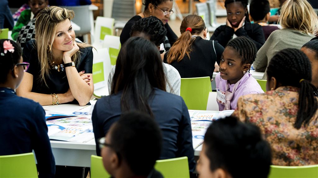 Máxima is erevoorzitter van het platform Wijzer in Geldzaken. Het is vrijdag de laatste dag van de Week van het geld die het platform organiseerde.