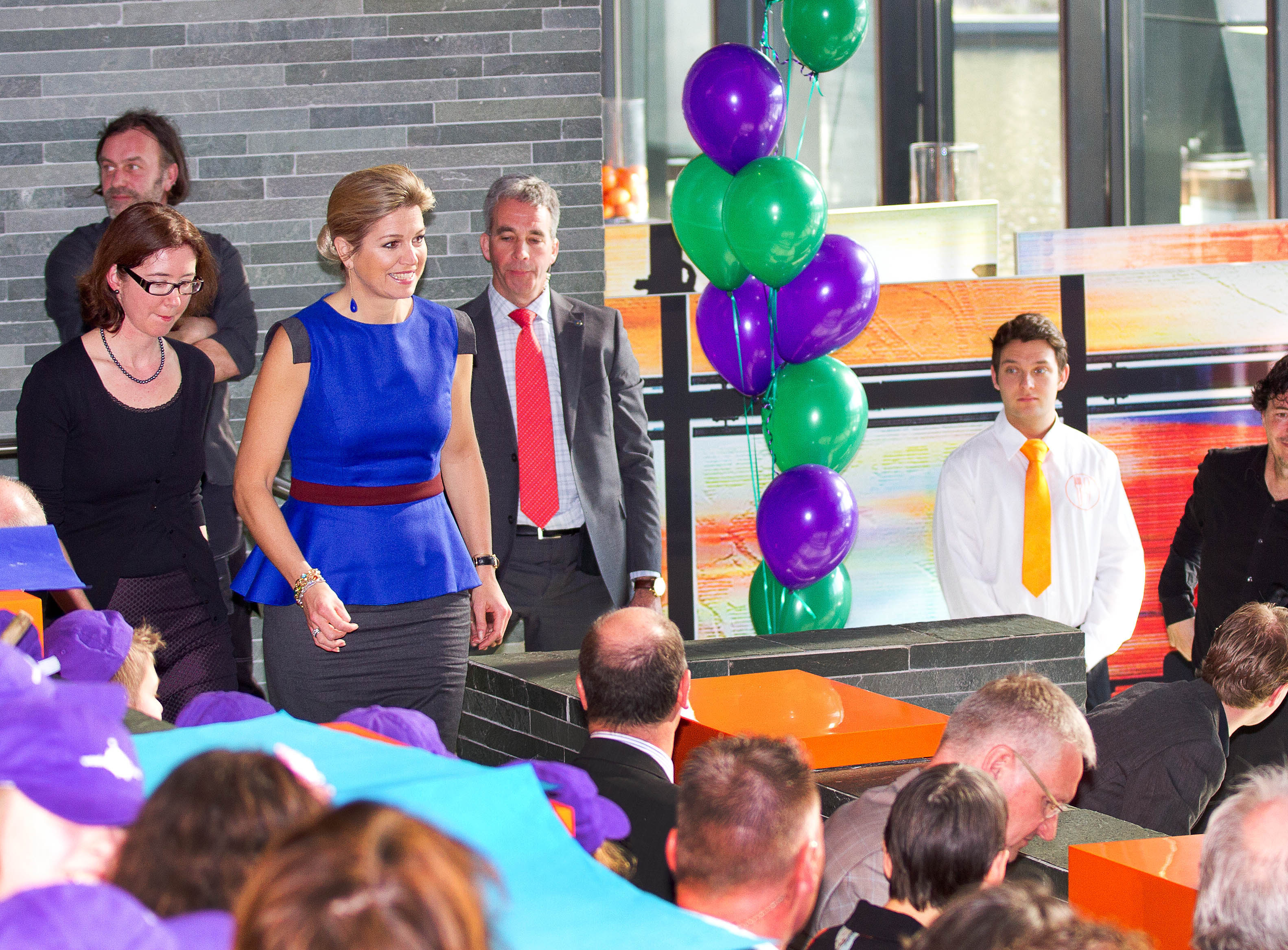 Koningin Máxima is weer terug in Nederland en heeft haar eerste optreden er alweer opzitten. In Hilversum opende ze vanmorgen de Week van het geld en sprak ze met leerlingen van de basisschool over verstandig omgaan met spaartegoeden en uitgaven. Voor de gelegenheid koos de koningin haar kobaltblauwe peplum (een top met schootje) van modehuis NATAN, gecombineerd met blauwe accessoires en een grijze rok. Oorbellen zijn van de Nederlandse ontwerpster Mirian van Kampen, die verantwoordelijk is voor een groot gedeelte van Máxima’s bijouterie.
