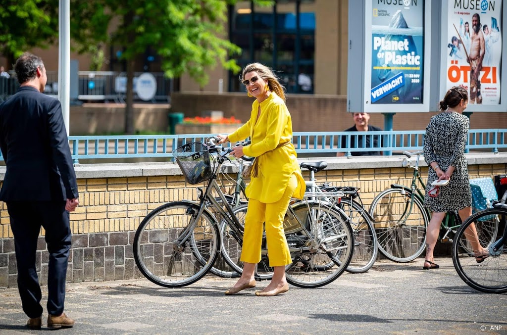Koningin Máxima heeft dinsdagmiddag het heropende Kunstmuseum in Den Haag bezocht. Op de fiets en in een geel broekpak was ze komen aanrijden bij het museum in haar eigen stad. Het museum was elf weken gesloten vanwege de corona-epidemie. Net als andere musea mag het Kunstmuseum sinds maandag weer beperkt bezoekers ontvangen.
