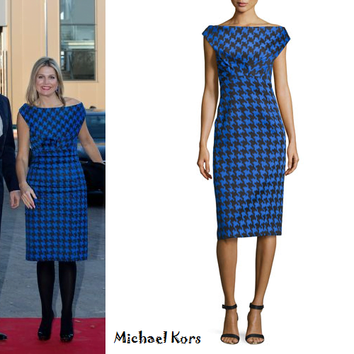 Tijdens het Koningsdagconcert in Dordrecht droeg koningin Máxima een kobaltblauwe japon met pied-de-poule print. Ontwerper van de jurk is de Amerikaan Michael Kors, die de afgelopen jaren vaker kleding mocht maken voor onze koningin. Via internet is de jurk van viscose, katoen en zijde te bestellen voor 1296 dollar. Interesse? Klik dan hier.