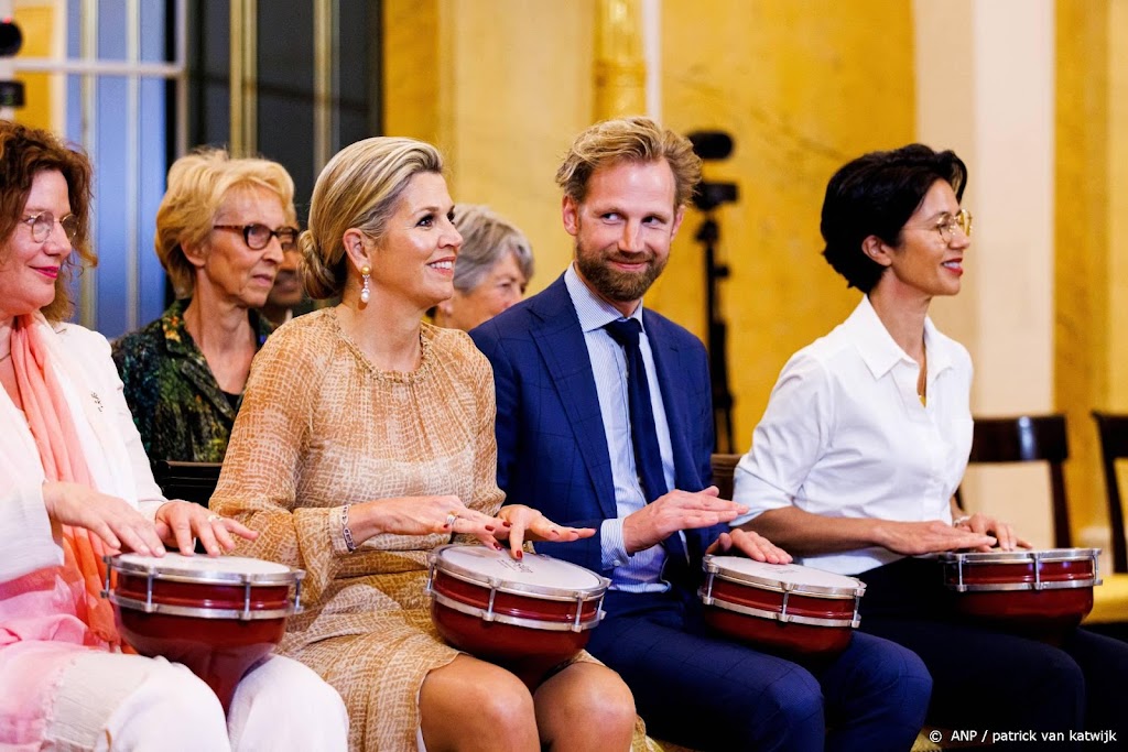 Koningin Máxima trommelt tijdens workshop over muziekonderwijs