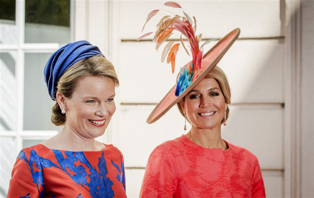De vorstinnen zorgden zelf ook voor kleur op de chique lommerrijke promenade. Máxima had voor knaloranje gekozen en collega Mathilde verscheen in een oranje-blauwe jurk. Niet allebei bijna hetzelfde, zoals eerder bij een gezamenlijk optreden, maar wel mooi op elkaar afgestemd.