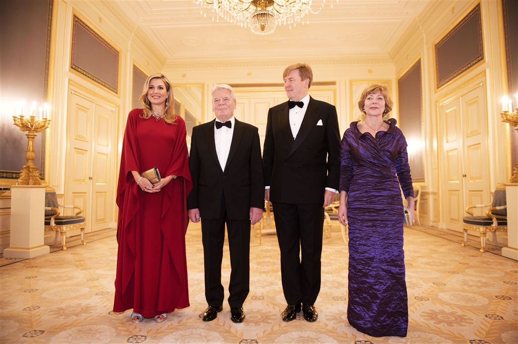 Koning Willem-Alexander en koningin Máxima dineerden maandagavond op Paleis Noordeinde met de Duitse president Joachim Gauck en zijn partner Daniela Schadt. “Vanavond vieren wij onze verbondenheid, hier in Den Haag”, zei Willem-Alexander in zijn toespraak bij het diner.