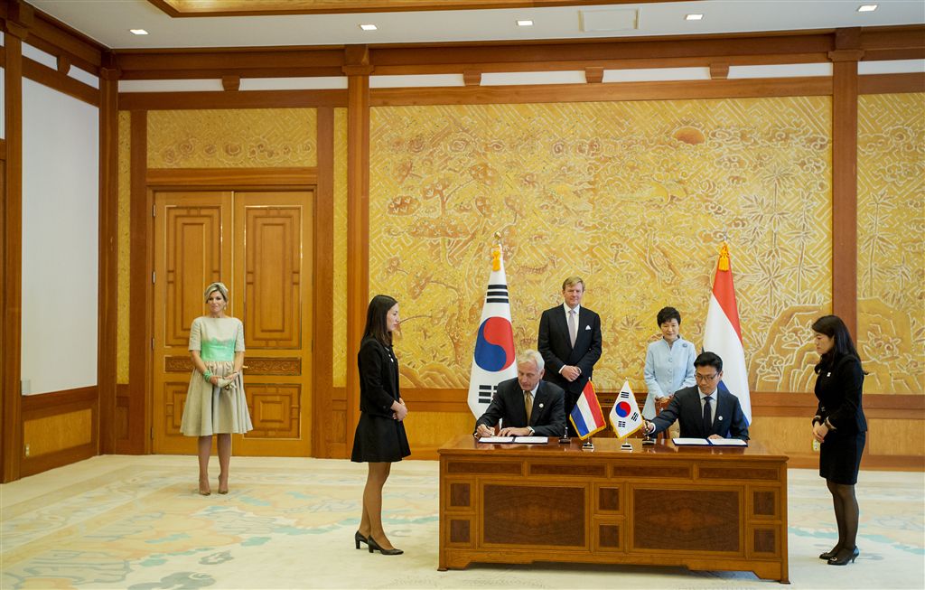 SEOUL – Onder het toeziend oog van koning Willem-Alexander, koningin Máxima en de Zuid-Koreaanse president Park Geun-hye hebben de schaatsbonden van Nederland en Zuid-Korea maandag in het presidentieel paleis in Seoul een samenwerkingsovereenkomst gesloten.