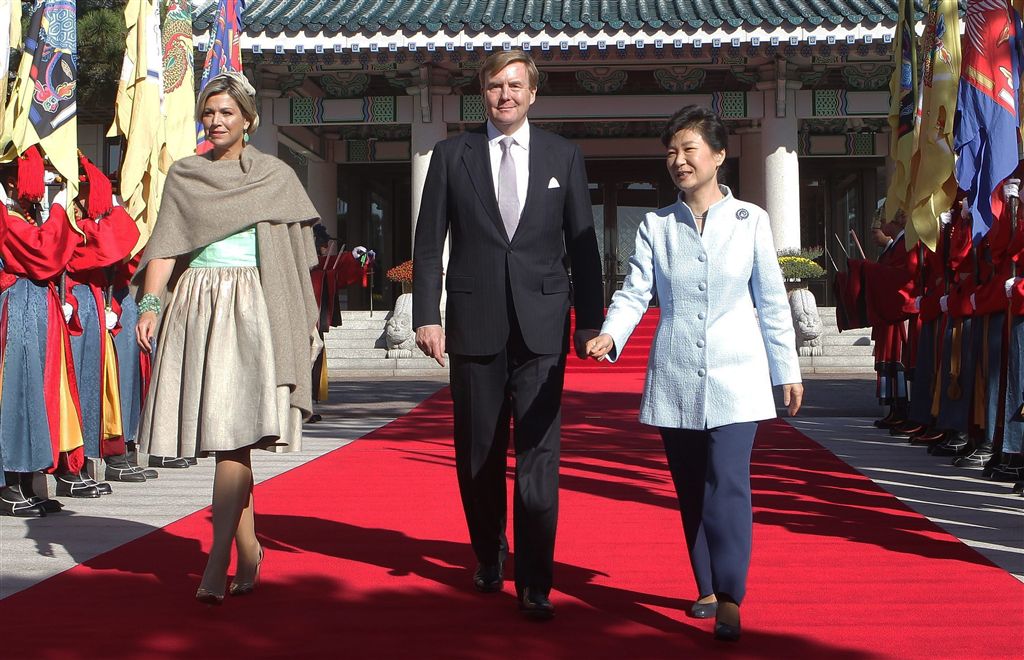 SEOUL – President Park Geun-hye van Zuid-Korea heeft maandagmorgen in de stralende herfstzon koning Willem-Alexander en koningin Máxima met veel kleurrijk ceremonieel officieel verwelkomd bij het presidentieel paleis Cheong Wa Dae, het Blauwe Huis.