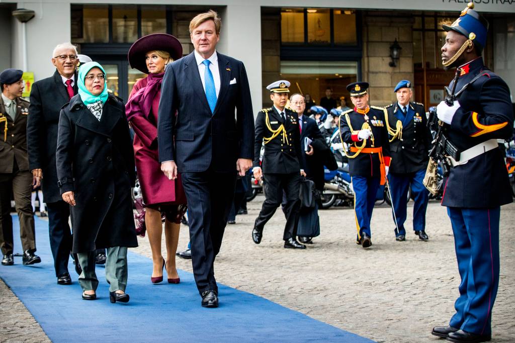 Koning Willem-Alexander en koningin Máxima hebben woensdagmorgen op de vrieskoude Dam in Amsterdam president Halimah Yacob van Singapore en haar echtgenoot Mohamed Abdullah Alhabshee verwelkomd aan het begin van hun driedaagse staatsbezoek aan Nederland. Koning en president inspecteerden vervolgens samen de erewacht.