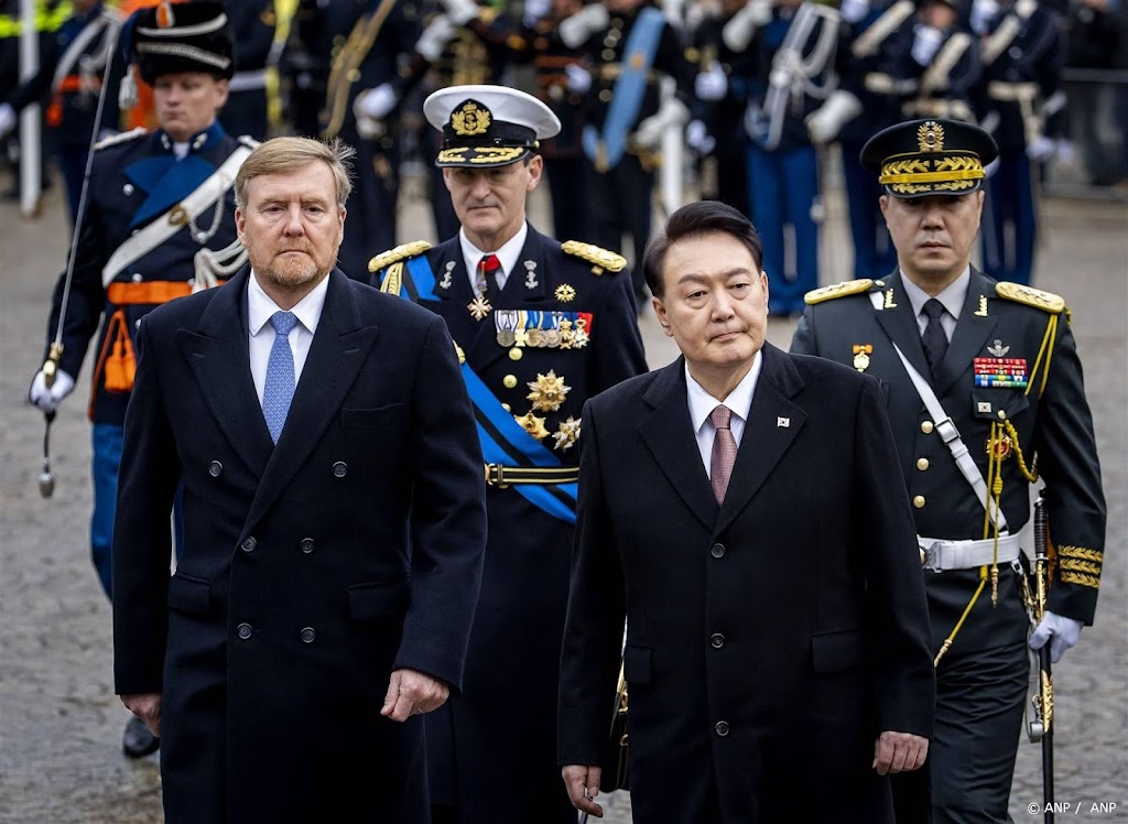 Koning Willem-Alexander en koningin Máxima hebben de Zuid-Koreaanse president Yoon Suk-yeol en zijn vrouw Kim Keon-hee dinsdagochtend verwelkomd op de Dam in Amsterdam. Het koppel bezoekt Nederland op dinsdag en woensdag.
