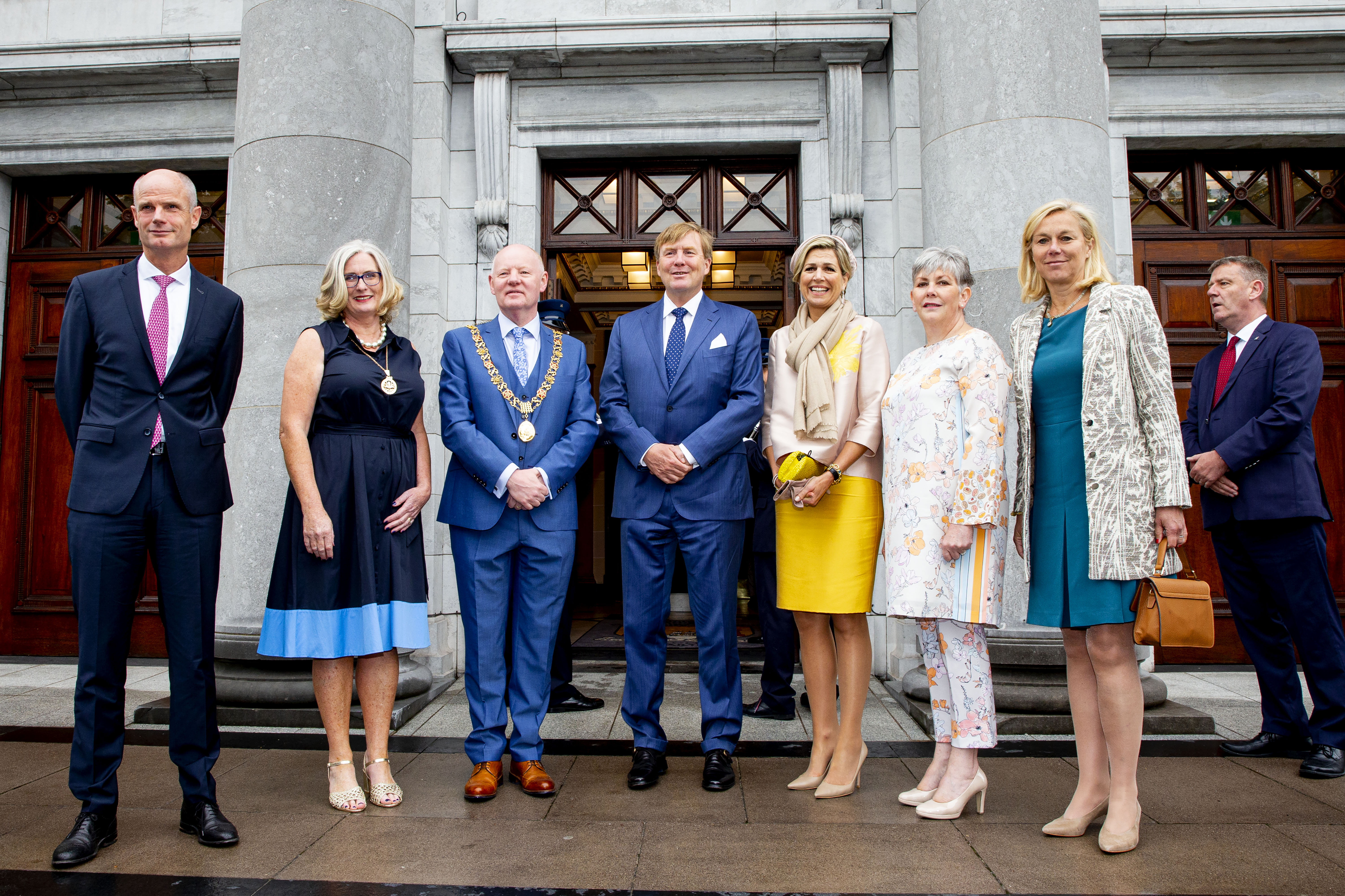 2019-06-14 11:31:22 CORK - Koning Willem-Alexander en koningin Maxima worden begroet door Lord Mayor, Lady Mayoress en mevrouw Doherty bij hun aankomst op het stadhuis van Cork, tijdens hun bezoek aan Ierland. ANP ROYAL IMAGES PATRICK VAN KATWIJK