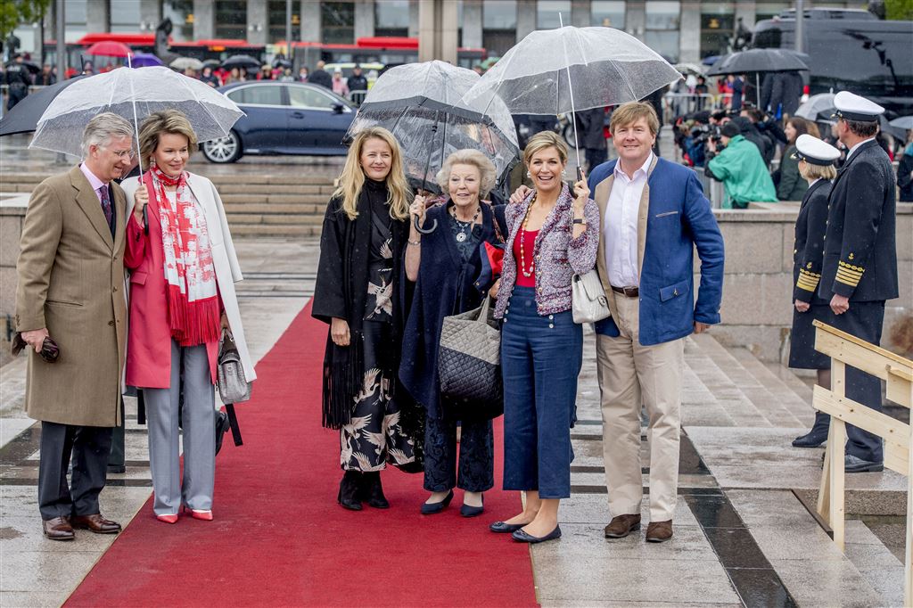 Koning Willem-Alexander, koningin Máxima, prinses Beatrix en prinses Mabel hadden woensdag een paraplu nodig in Oslo. Ze gaven acte de présence op de tweede dag van de festiviteiten voor de Noorse koning Harald en koningin Sonja, die de Europese koningshuizen hebben uitgenodigd voor hun tachtigste verjaardag.
