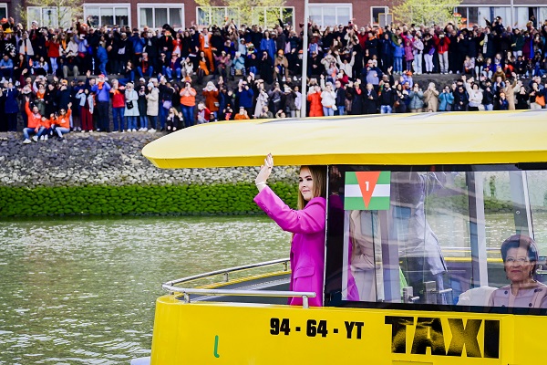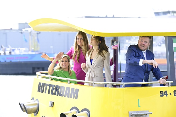 De koninklijke familie is donderdag op Koningsdag met watertaxi’s over de Nieuwe Maas in Rotterdam gevaren. De Oranjes zwaaiden vanaf de watertaxi’s naar het publiek aan de kant. Willem-Alexander, Máxima en hun aanwezige dochters Amalia en Ariane hingen over de reling om te zwaaien.