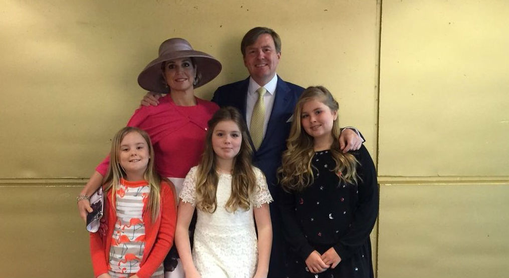 De eerste foto van vandaag van het koninklijk gezin. Koningin Máxima draagt een creatie van modehuis Natan.