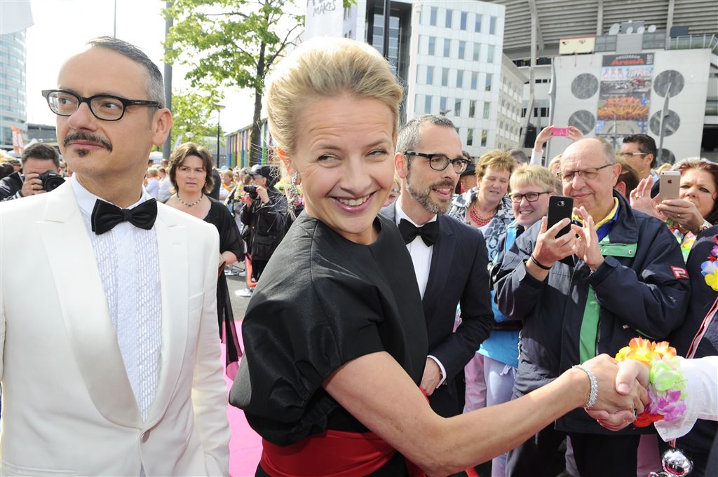 AMSTERDAM – Prinses Mabel arriveerde zaterdagavond met couturiers Viktor Horsting en Rolf Snoeren bij de Heineken Music Hall, waar het jaarlijkse AmsterdamDiner werd gehouden. De opbrengst van het benefietdiner gaat naar onderzoek van de aidsactivisten die vorig jaar omkwamen bij de vliegramp met de MH17.