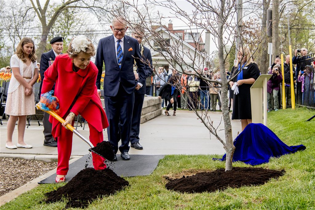 Prinses Margriet heeft dinsdagmiddag samen met echtgenoot prof. mr. Pieter van Vollenhoven in Burlington een boom geplant in het Apeldoorn Park. De Canadese stad heeft sinds twaalf jaar een stedenband met de woonplaats van Margriet. De boom dient ter herinnering aan het bezoek aan Burlington, dat een flinke Nederlandse gemeenschap telt.