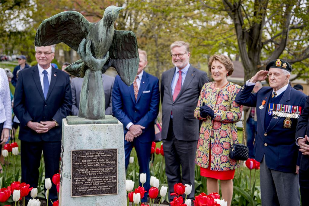 Enkele honderden inwoners en veteranen van het naar het Engelse Stratford upon Avon – stad van Shakespeare – vernoemde plaatsje in de provincie Ontario waren uitgelopen voor de plechtigheid rond het monument in de Dutch Memorial Garden. In het Canadese Stratford – beter bekend als de geboorteplaats van popfenomeen Justin Bieber – was tijdens de oorlog de Prinses Julianakazerne, waar Nederlanders die bij het uitbreken van de oorlog in Amerika en Canada verbleven een militaire opleiding kregen.