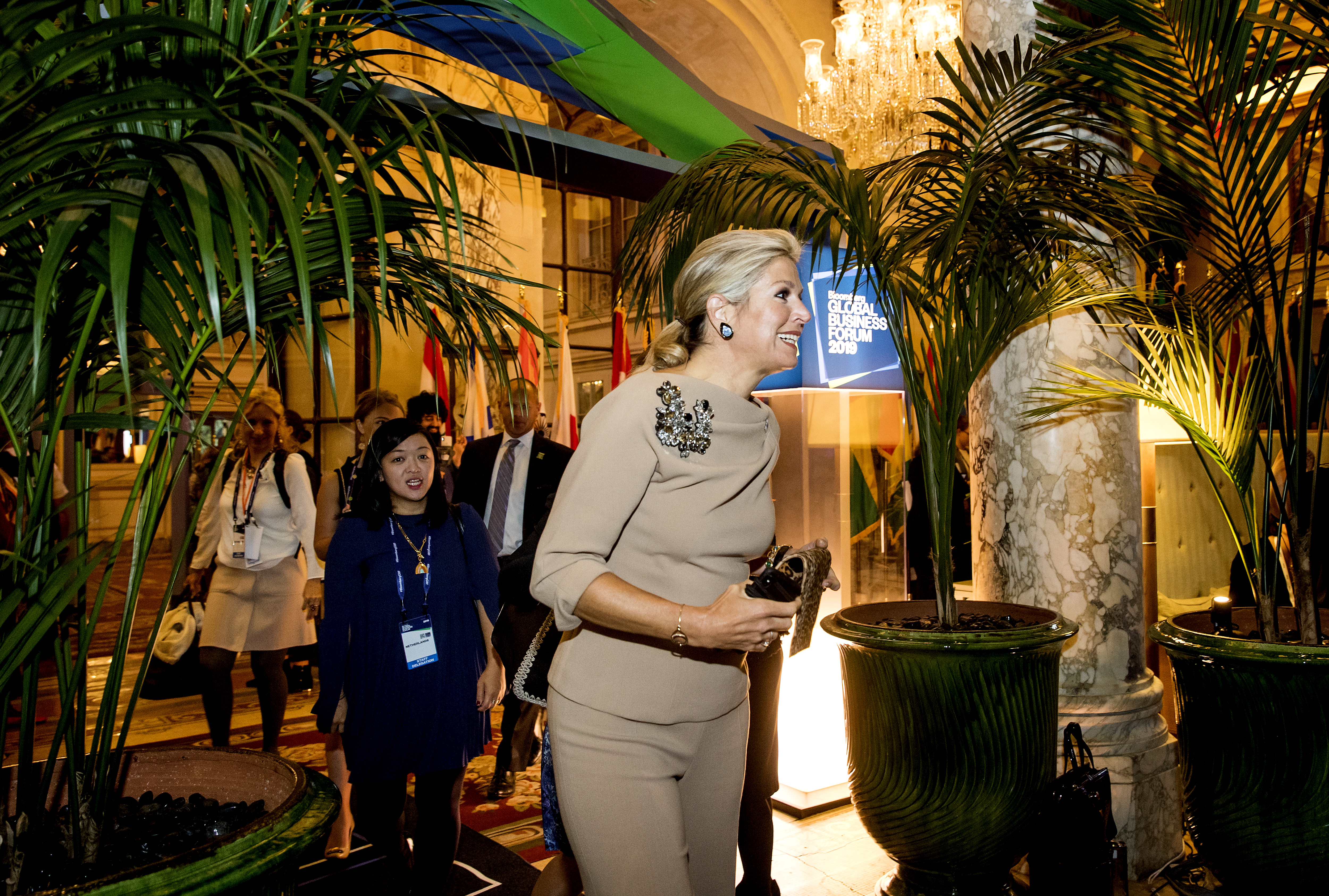De koningin blijft de hele ochtend bij het zakenforum, waar de Indiase premier Narendra Modi de openingstoespraak houdt. Modi gaat daarna in gesprek met Michael Bloomberg, succesvol zakenman en oud-burgemeester van New York. Daarna volgen tal van discussiesessies, met onder meer deelname van Christine Lagarde, de nieuwe president van de Europese Centrale Bank, en de Nieuw-Zeelandse premier Jacinda Ardern. Bij de lunch houdt Máxima een korte toespraak.