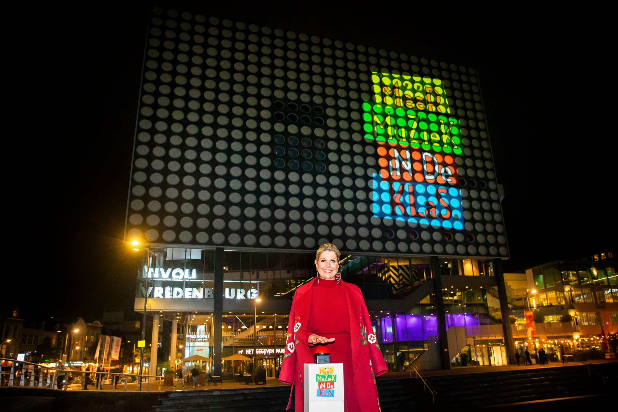 De koningin zette aan het einde van de samenkomst buiten een videoprojectie in werking waardoor op de gevel van het theater tientallen jeugdfoto’s verschenen van mensen die hun muziekinstrument toonden. Die foto’s waren de afgelopen dagen verzameld via een oproep op sociale media om onder het motto ‘Ik ben voor #meermuziekindeklas’ een opname te delen.